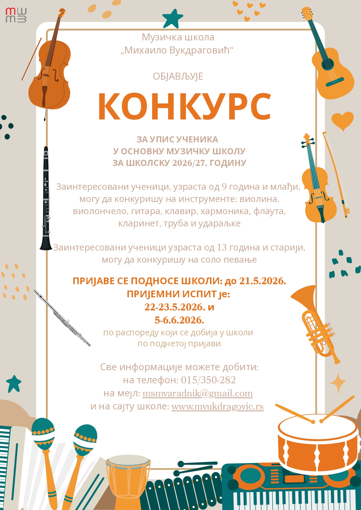 Na ovom sajtu možete saznati sve o aktivnostima naših učenika i profesora… o budućim i održanim koncertima… o takmičenjima koja se organizuju u našoj školi… o najuspešnijim đacima i nagradama koje su osvojili… o informacijama u vezi organizacije rada škole… o prijemnim ispitima i upisu novih učenika… ukoliko su vam potrebne dodatne informacije, kontaktirajte nas…